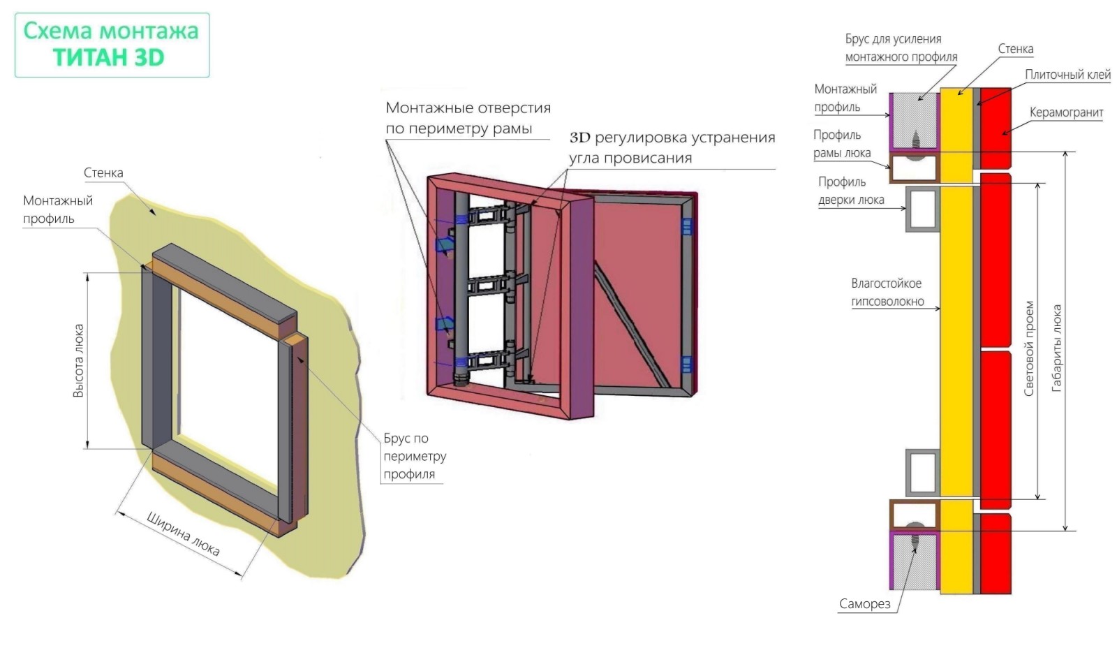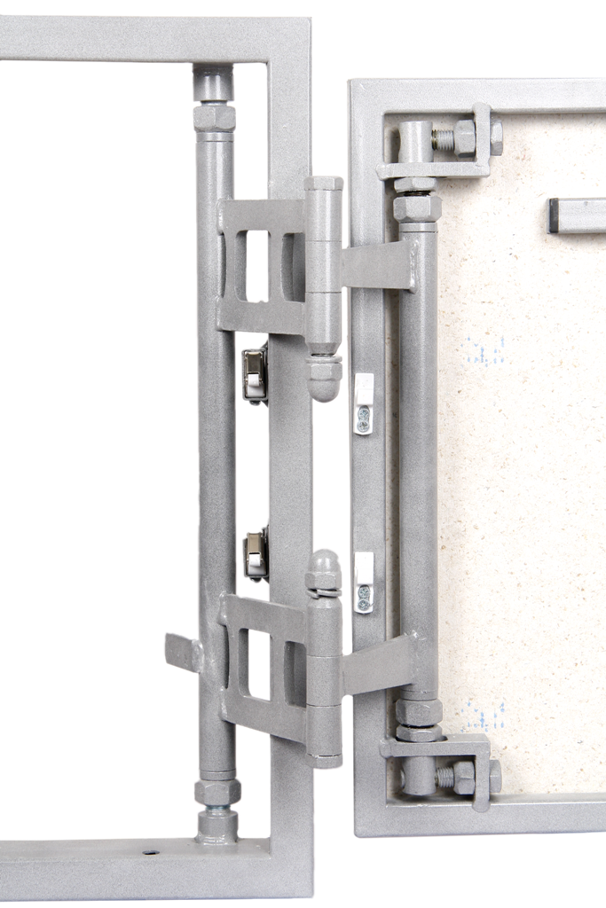 Специальная пространственная петля с системами регулировок вырезанная на плазменном станке из 5 мм стали, прошла тест и испытания в профессиональных лабораториях позволяет отрегулировать облицованную дверцу по горизонтали, вертикали и углам наклона. Открытие закрытие дверцы осуществляется лёгким нажатием на правый или левый край стороны, ход при этом плавный и лёгкий даже с тяжелым облицовочным материалом.Прочная и надежная сварная каркасная рама из металлической стальной трубы позволяет изготовить ревизионный люк под крупную плитку как керамогранит, натуральный либо искусственный камень.